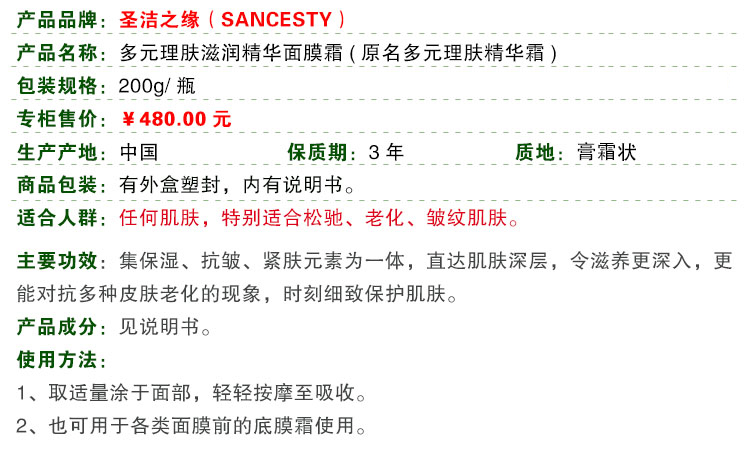 产品功效:集保湿、抗皱、紧肤元素为一体,直达肌肤深层,令滋养更深入,更能对抗多种皮肤老化的现象,时刻细致保护肌肤。