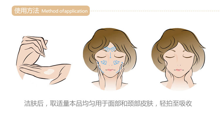 使用方法:洁肤后取适量本品均匀用于面部和颈部,轻轻按压至吸收。