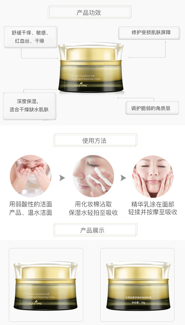 产品功效:对脆弱不适的肌肤具有良好的舒缓抚慰作用,能滋润修复脆弱肌肤,在肌肤表面形成修复保护膜,令肌肤柔嫩光洁,恢复原有光泽和活力。