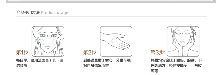 使用方法:洁肤爽肤后,取本品适量均匀涂于面部,轻柔打圈至吸收。