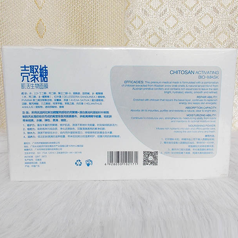 3、保湿性:壳聚糖面膜具有很好的透气性和保水率,一般保水率在150%以上,高亲水性可增加皮肤舒适感,保护皮肤不干燥。
