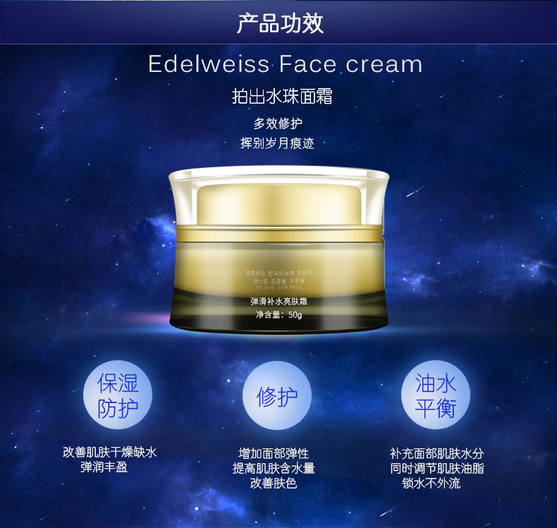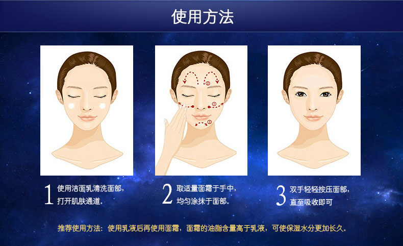 使用方法:洁肤爽肤后,取本品适量均匀涂于面部轻柔打圈至吸收。