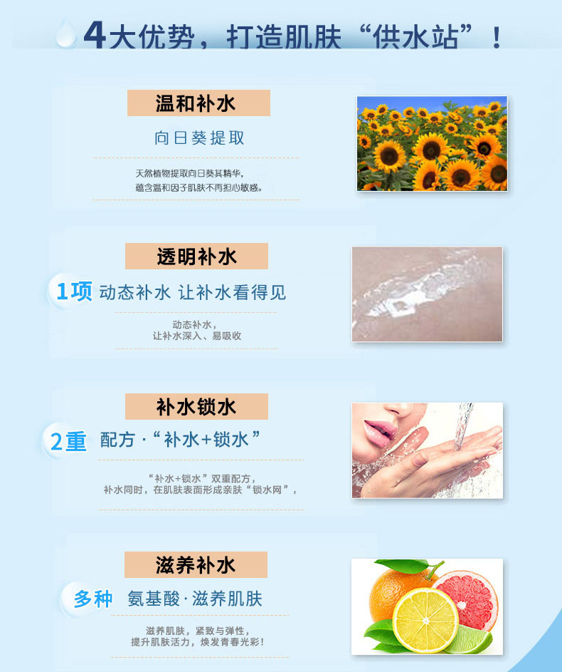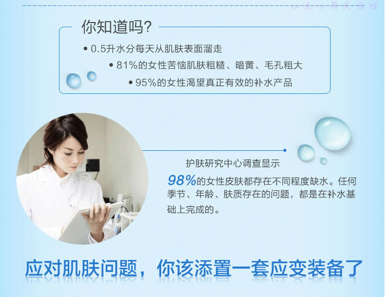 产品功效:专为缺水、干涩肌肤调配,能大量补充所缺水分养分,平复干燥引起的幼纹和粗糙,防止肌肤松弛,令肌肤获得充分滋养,柔嫩而充满弹性。