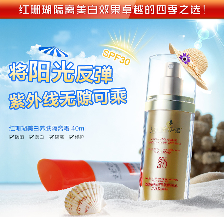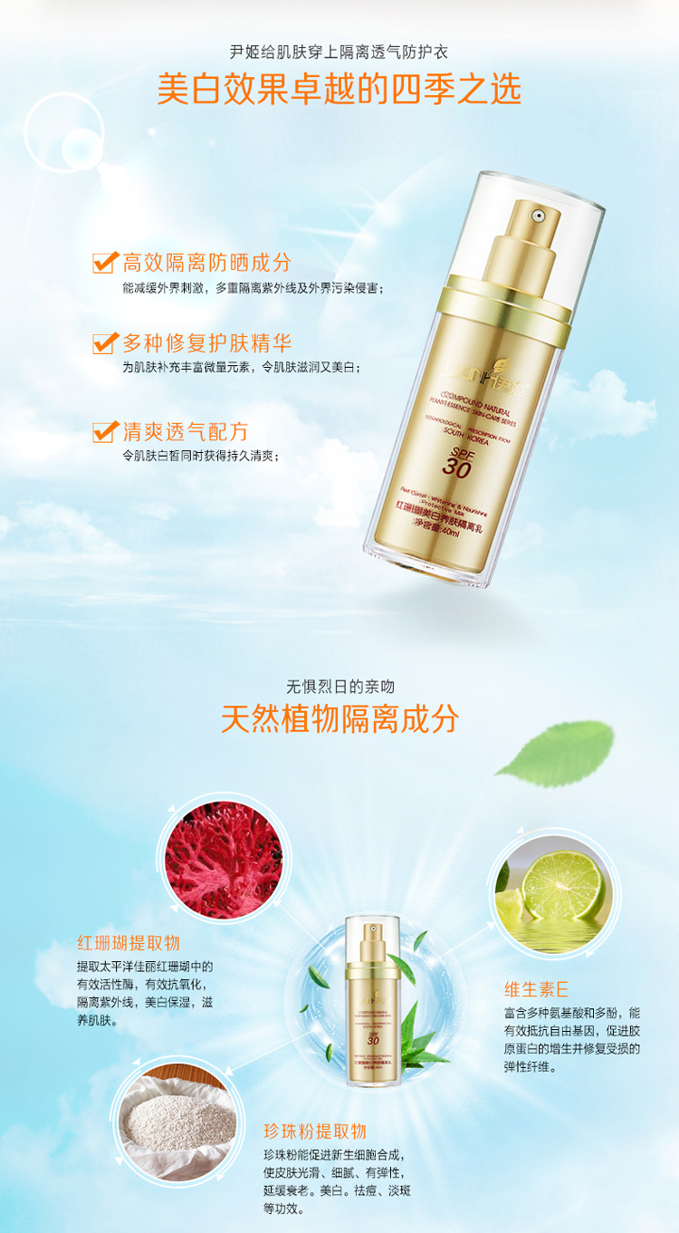 产品功效:含隔离防晒剂及多种修复护肤成分,能充分调动肌肤生理活性,多重隔离紫外线及外界污染对肌肤的侵害,减缓外界刺激,并为肌肤补充丰富微量元素,令肌肤滋润亮白,细腻如新。