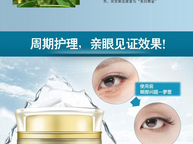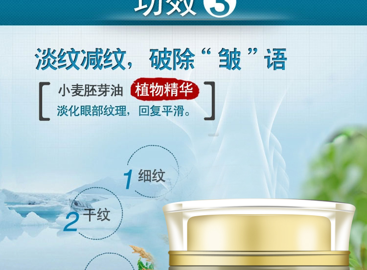 产品功效:针对松弛、细纹的眼周皮肤特点,充分补充肌肤所缺水分和养分,有提高眼部肌肤紧致度,改善松弛、提亮肤色,令双眸富有弹性,更加明亮生辉。