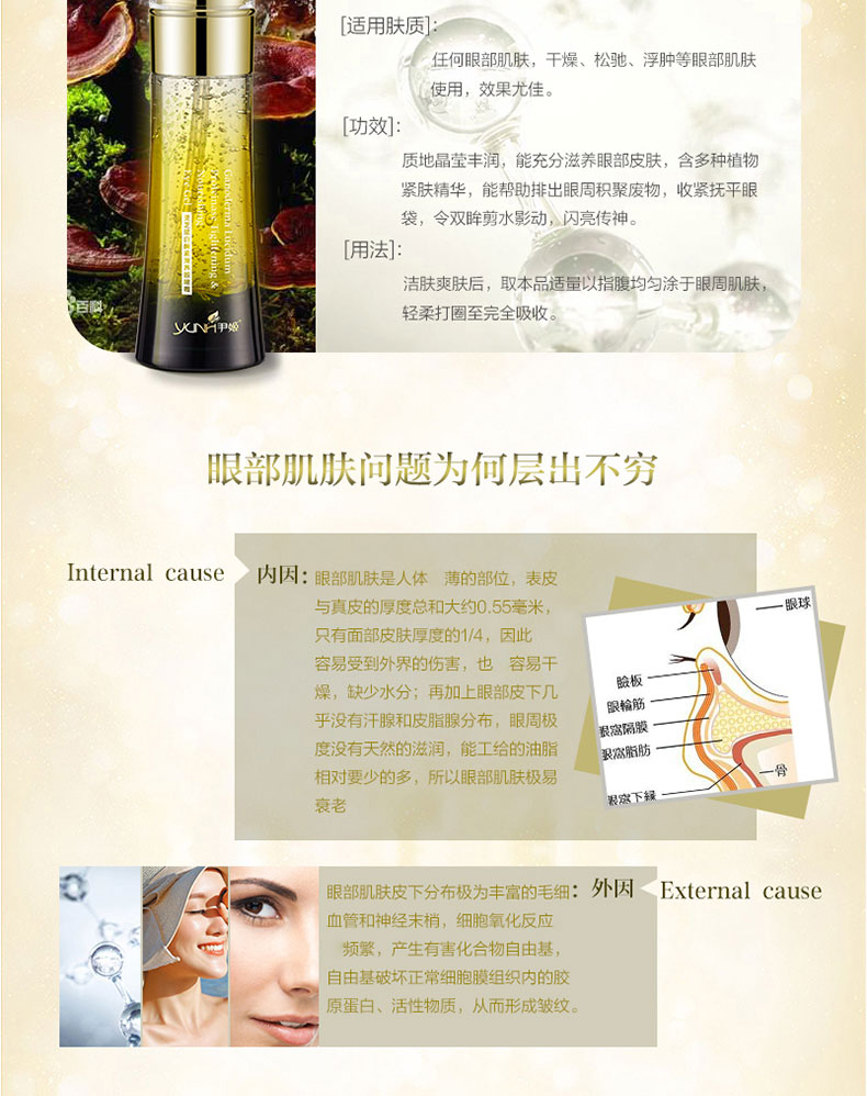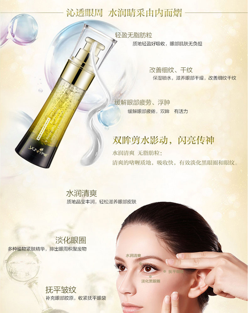 产品功效:改善眼袋,配方,深层保湿,促进眼部肌肤的,活化、激发肌肤生长发育组织,平复眼部皱纹,将凸出的眼下脂肪袋收回,改善眼袋,令双眸剪水影动,闪亮传神。