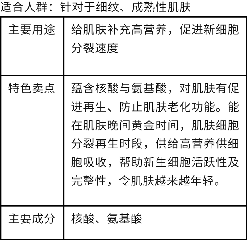 产品特点:给肌肤补充高营养,促进肌底焕新。蕴含核酸与氨基酸,对肌肤有促进新生、防止肌肤老化功能。能在肌肤晚间黄金时间,供给高营养供肌底吸收,帮助新生肌底活跃性及完整性,令肌肤越来越年轻。时光倒流淡皱霜浓缩绿茶提取液,燕麦葡萄糖,提供给肌底高能量营养素,从根本上阻止肌底老化,淡皱,滋养,抗老化。润泽保湿润肤霜磷脂囊,生化醣醛酸,胶原蛋白,有效改善皮肤水分、弹性和滋润。