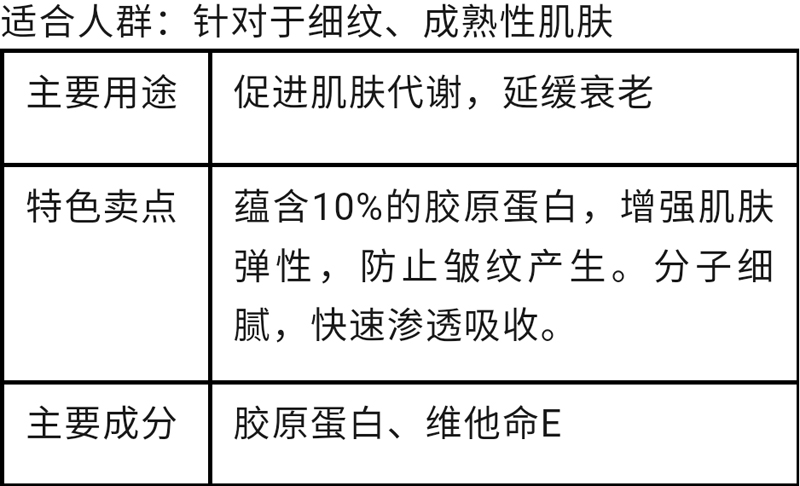 产品特点:促进肌肤代谢,减缓肌肤老化。蕴含10%的胶原蛋白,增强肌肤弹性,防止皱纹产生。分子细腻,快速渗透吸收。