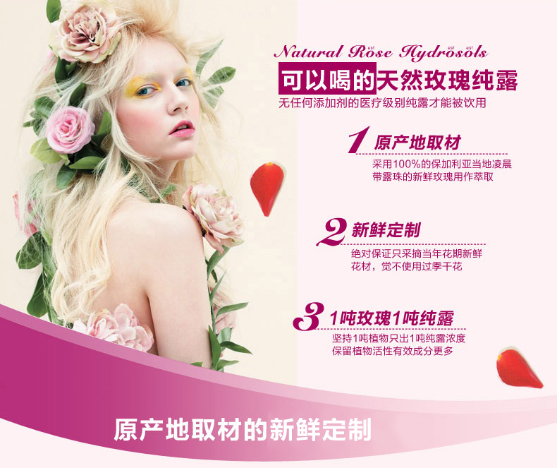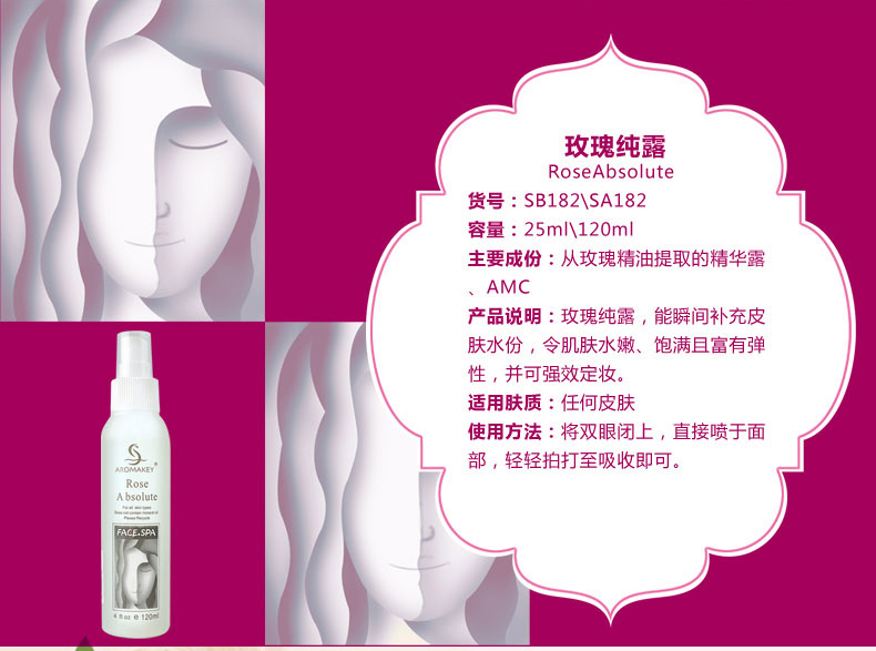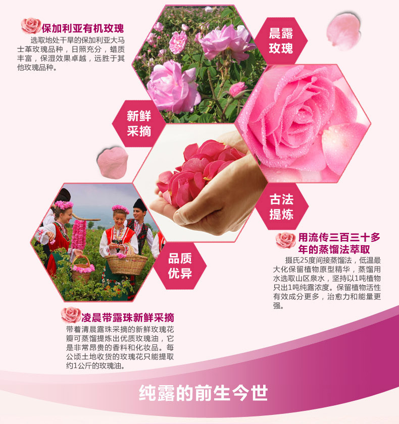产品说明:玫瑰纯露,能瞬间补充皮肤水份,令肌肤水嫩、饱满且富有弹性,并可强定妆。