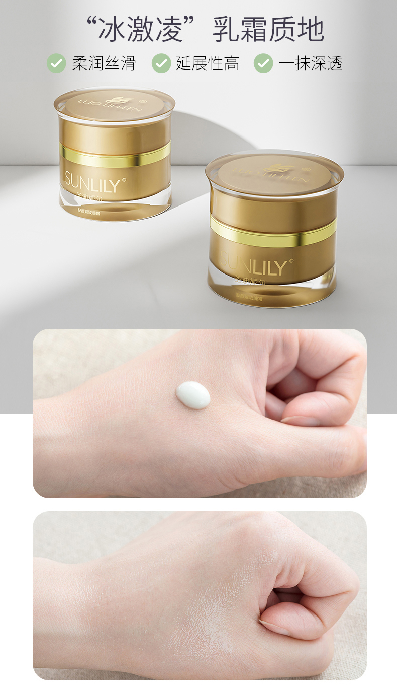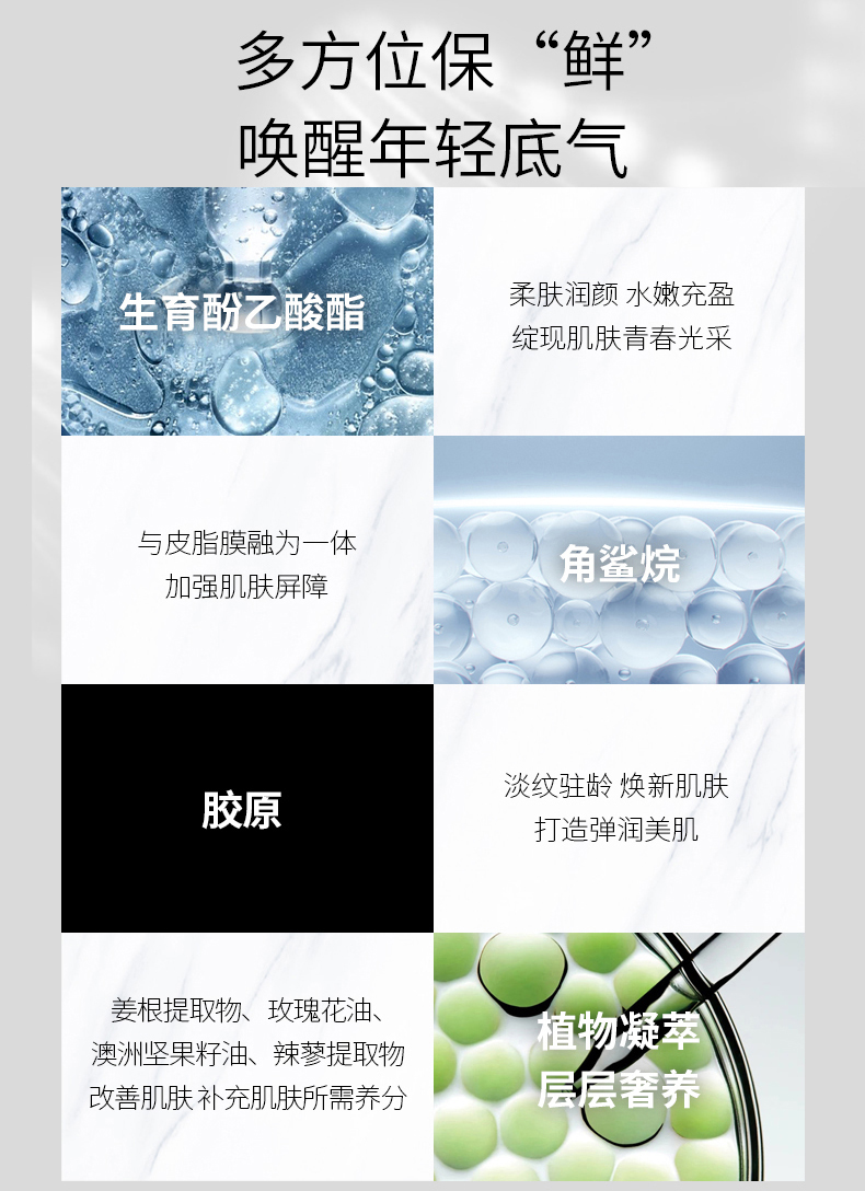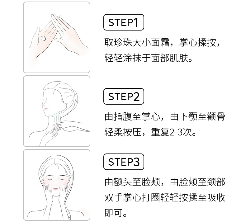含丰富小分子活性胶原多肽,补充胶原蛋白和弹力蛋白,提高皮肤的含湿度,加强皮肤的弹性,修复肌肤,将干燥、细纹暗沉皮肤有效改善, 为肌肤带来健康活力。(每日晚间使用精华液后,取适量产品均匀涂于全脸至吸收)