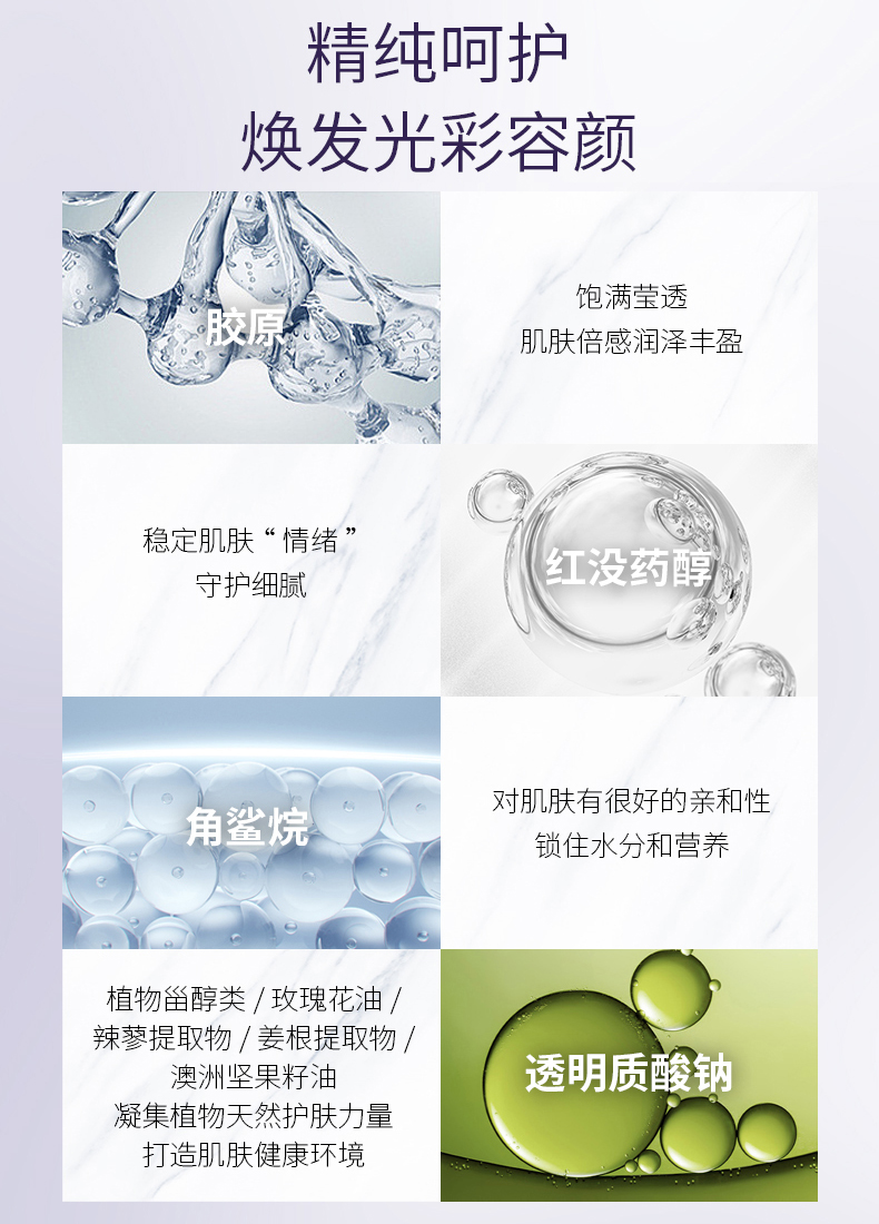 蕴含多种舒缓成分,修护肌肤,淡化细纹,使肌肤净爽润养,温和舒缓,同时养护痘痘肌肤,让肌肤倍添健康光彩