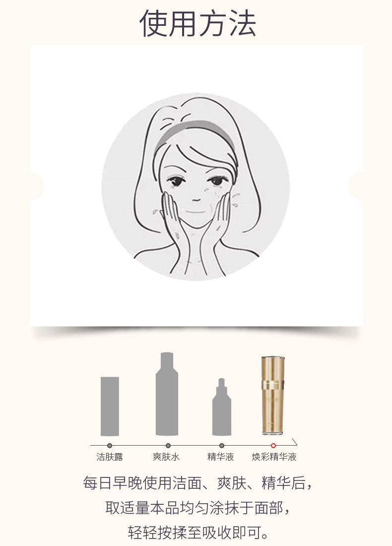 蕴含舒缓成分,释放修护能量,舒缓肌肤,收细毛孔,改善细纹、皱纹、提升肌肤红润度,令肌肤紧实弹润,光彩鉴人,透亮焕颜