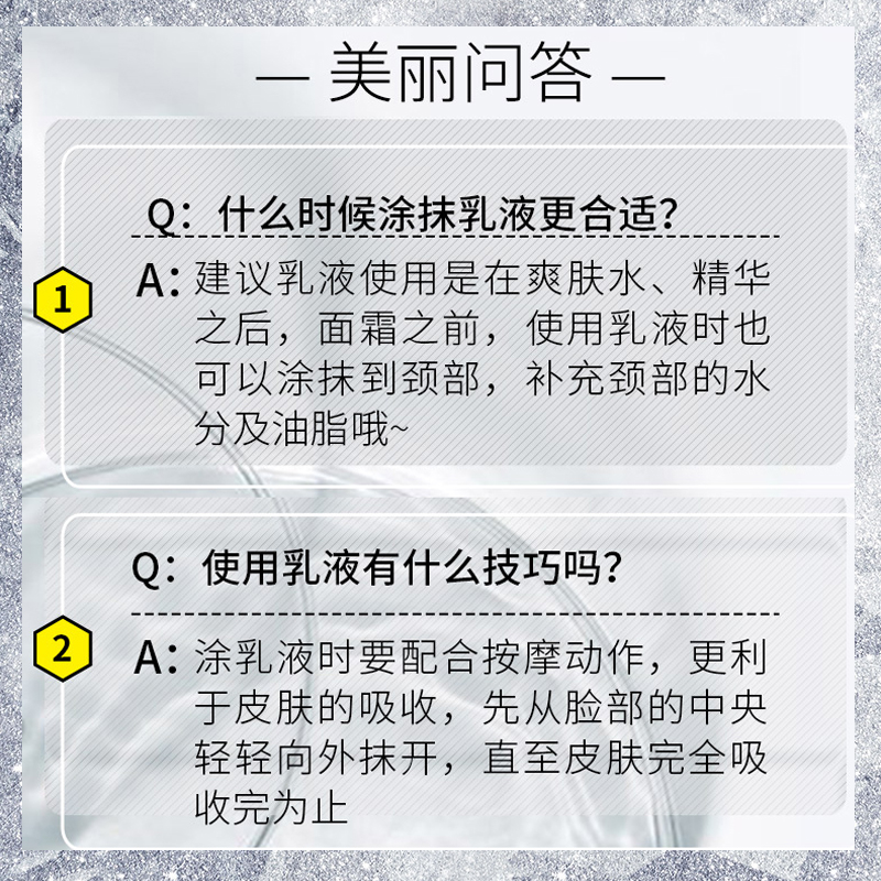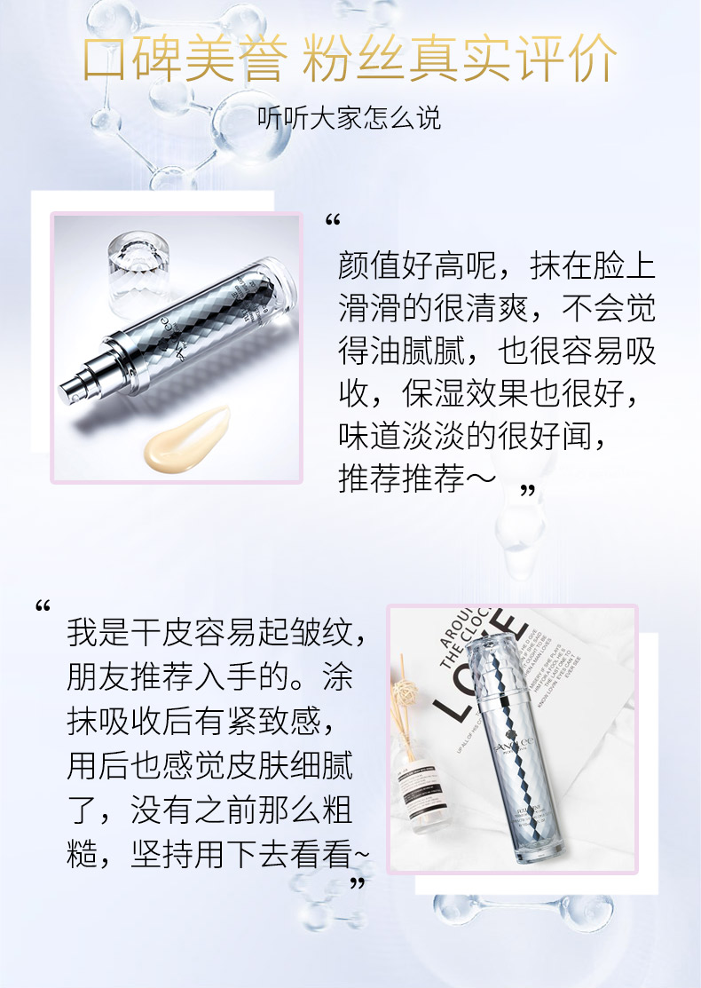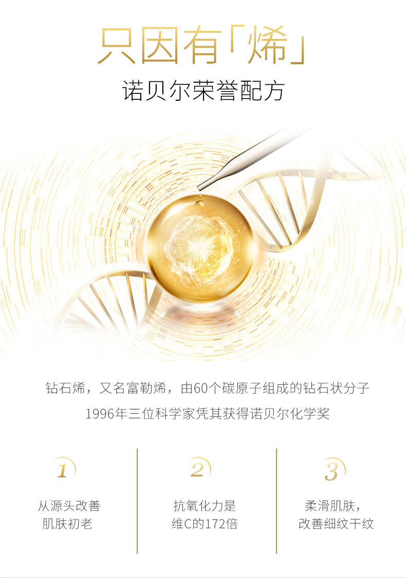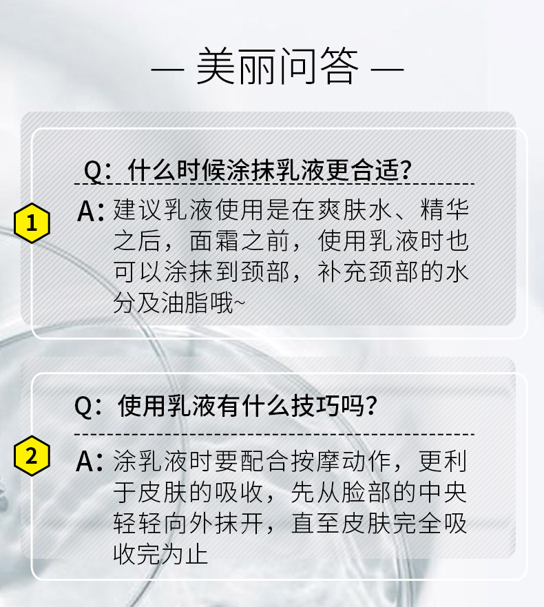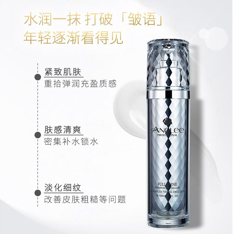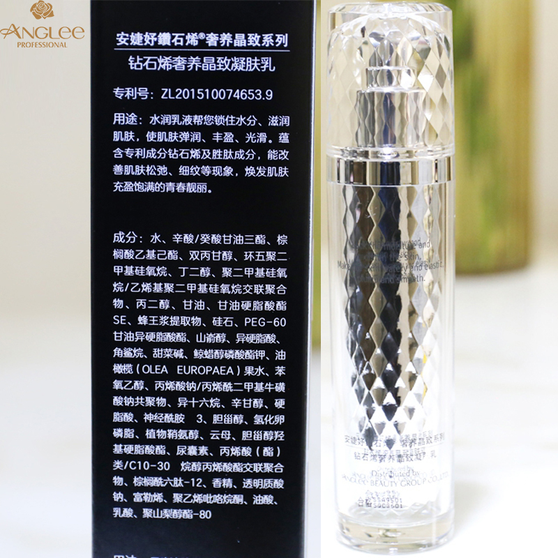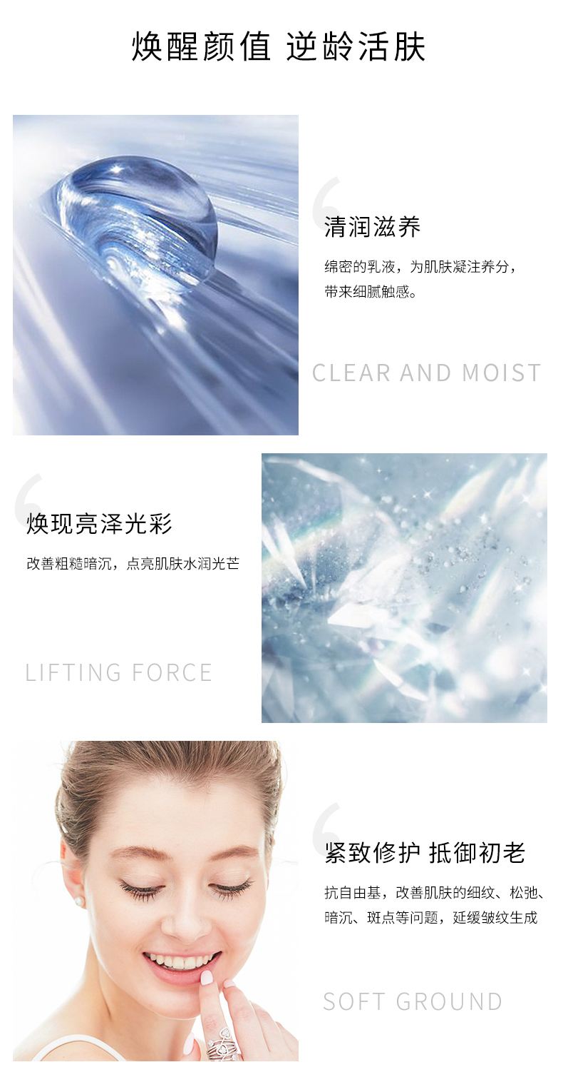 水润乳液帮您锁住水分、滋润肌肤,使肌肤弹润、丰盈、光滑。蕴含专/利成分钻石烯及胜肽成分,能改善肌肤松弛、细纹等现象,焕发肌肤充盈饱满的青春靓丽(尤其适合松弛,无弹性,有细纹的肌肤)