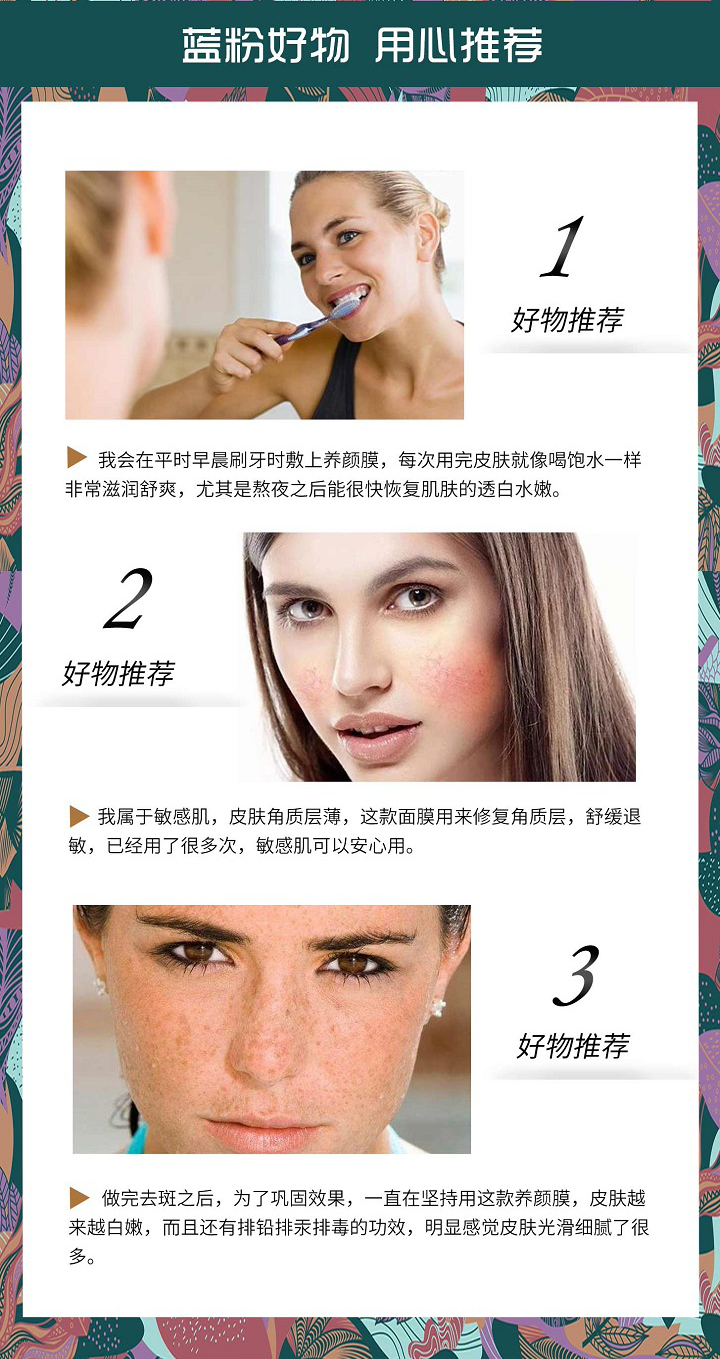 以黑焕白,黑不再来! 排铅排汞******素,收缩毛孔,紧肤抗皱,自然净白美肌,对各种顽固黄褐斑、反弹斑、反黑皮肤、使用其他化妆品无效或过量者有效果!