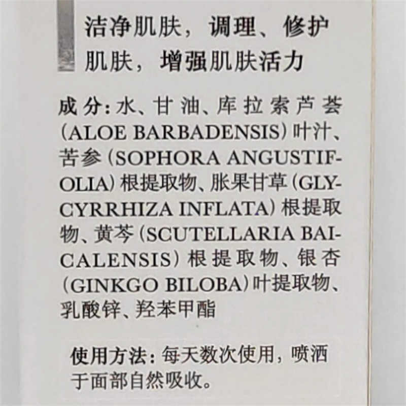 营养肌肤,调护肌肤,增强肌肤活力。对表皮创口清洁,预防感染,无副作用(每天可以使用多次,喷洒于面部自然吸收)