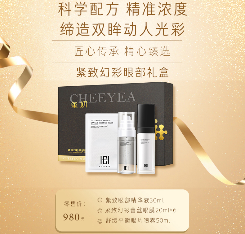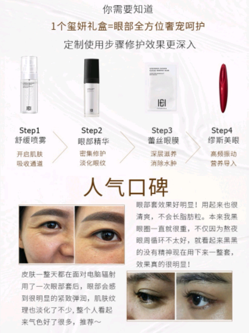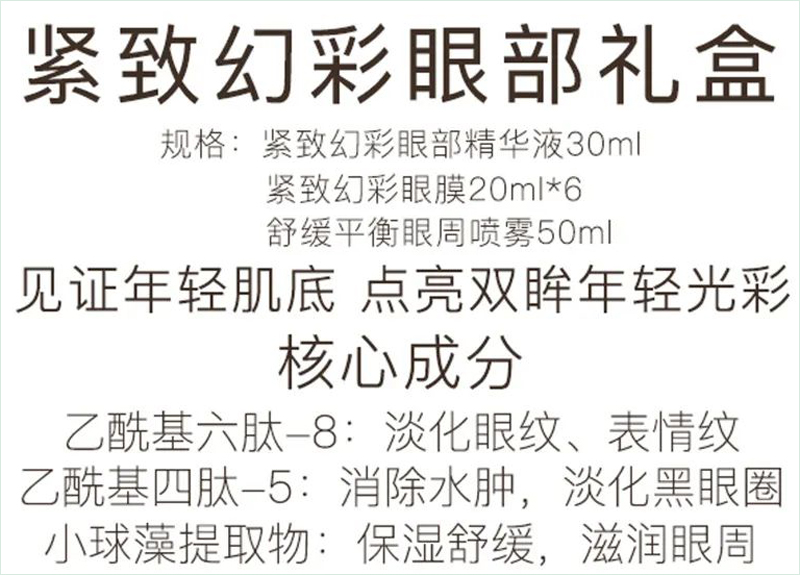 1.紧致幻彩眼部精华30ml:密集修护效淡化黑色圈 2.紧致幻彩眼膜20ml*6片:淡化黑眼圈,提亮眼周肤色 3.舒缓平衡眼周喷雾50ml:有效抗蓝光,防护眼周肌肤