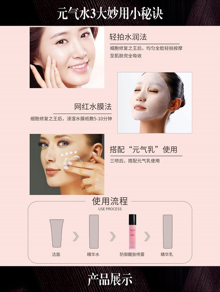 植物萃取精华帮助肌肤补充水分,唤醒肌肤,多种活性成分层层滋养焕靓肌肤,令肌肤莹润靓透,散发光彩。