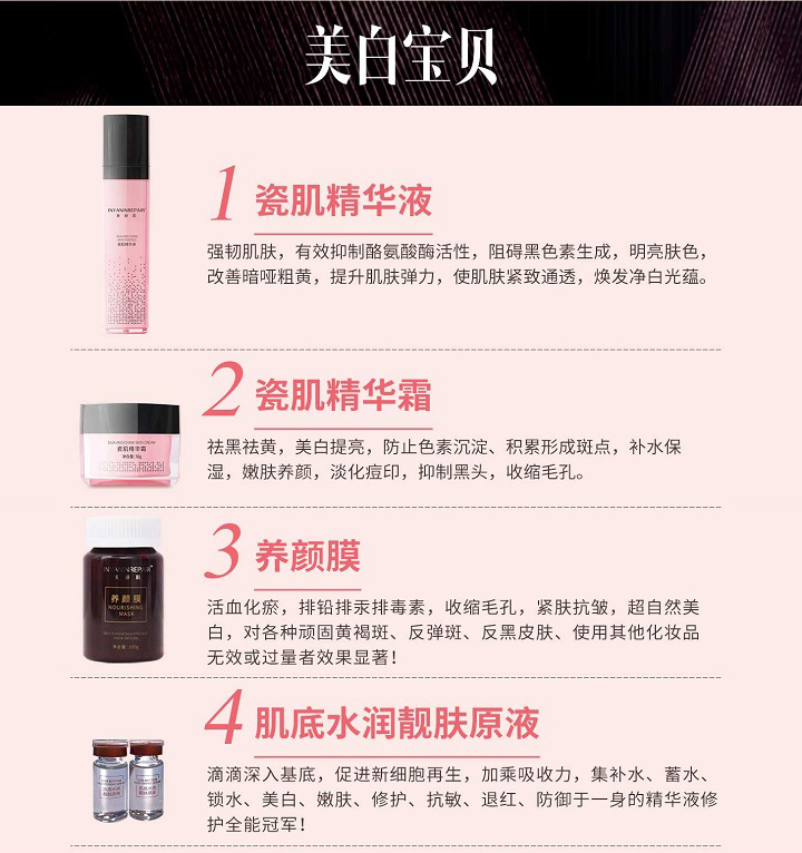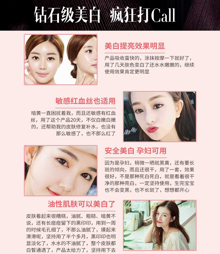 有效净透,收缩毛孔、吸附代谢杂质和色素;强韧肌肤,即时给养、加乘吸收;钻石亮白;三阶亮白疗法、钻石级配方,肌肤透无瑕、嫩出水、白发光