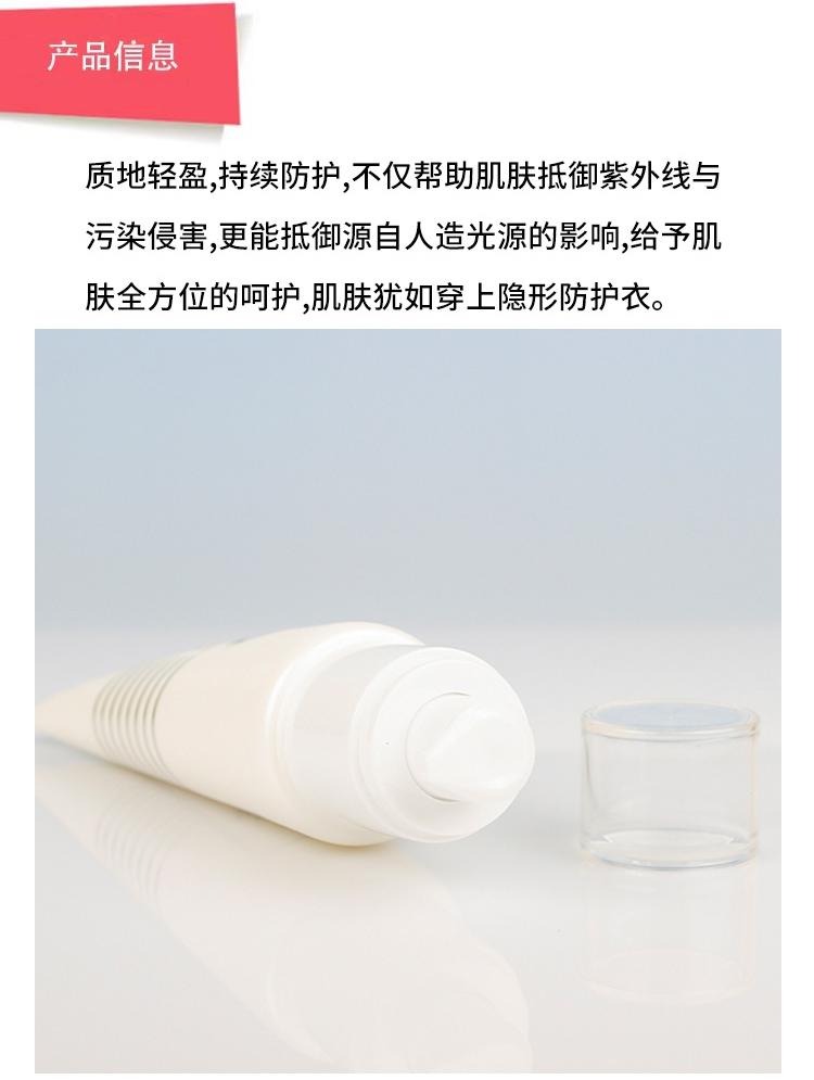 清透防护配方,轻盈透薄、服贴,清爽不油腻,令肌肤远离厚重负担,保护皮肤免受外界环境伤害,为皮肤带来更佳防护,令肌肤更显透亮、自然;面部、身体部位皮肤均适用