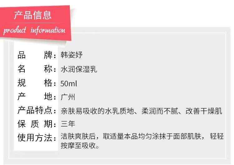 韩姿妤 水润保湿乳50ml 柔润而不腻、层居心润、盈亮美肌、改善干燥/粗糙现象