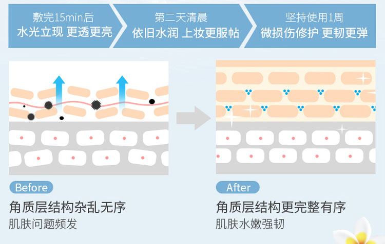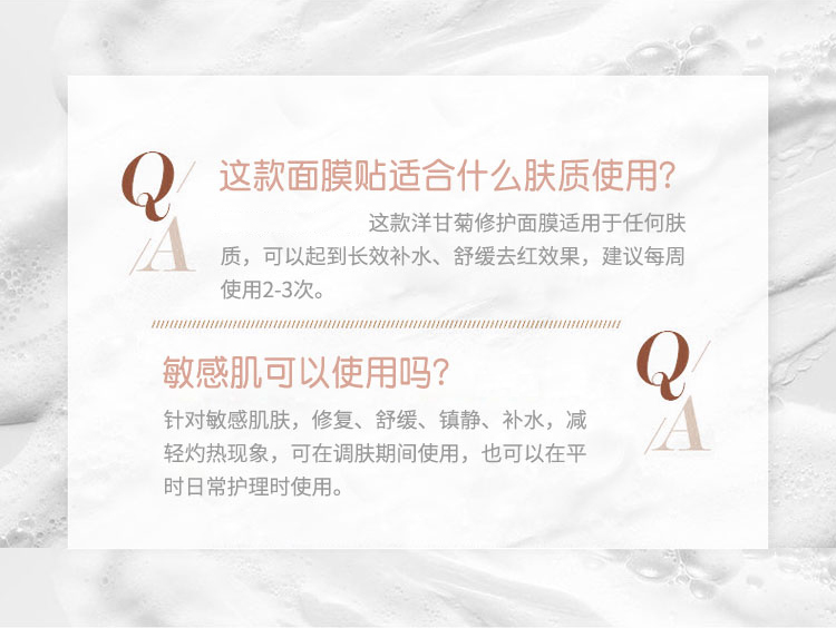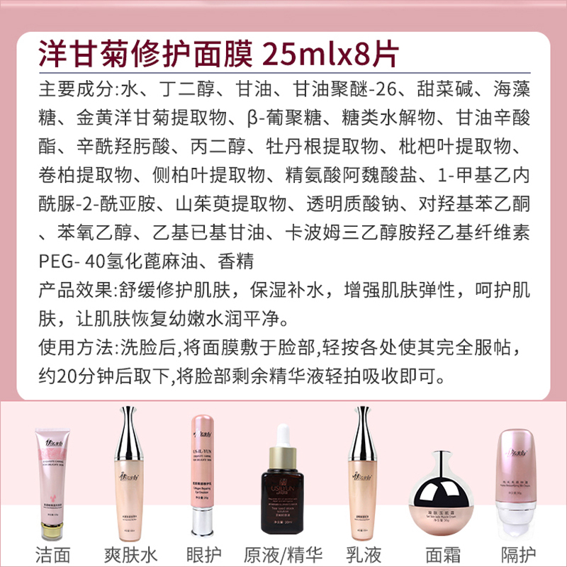 舒缓修护肌肤,保湿补水,增强肌肤弹性,呵护肌肤,让肌肤恢复幼嫩水润平净