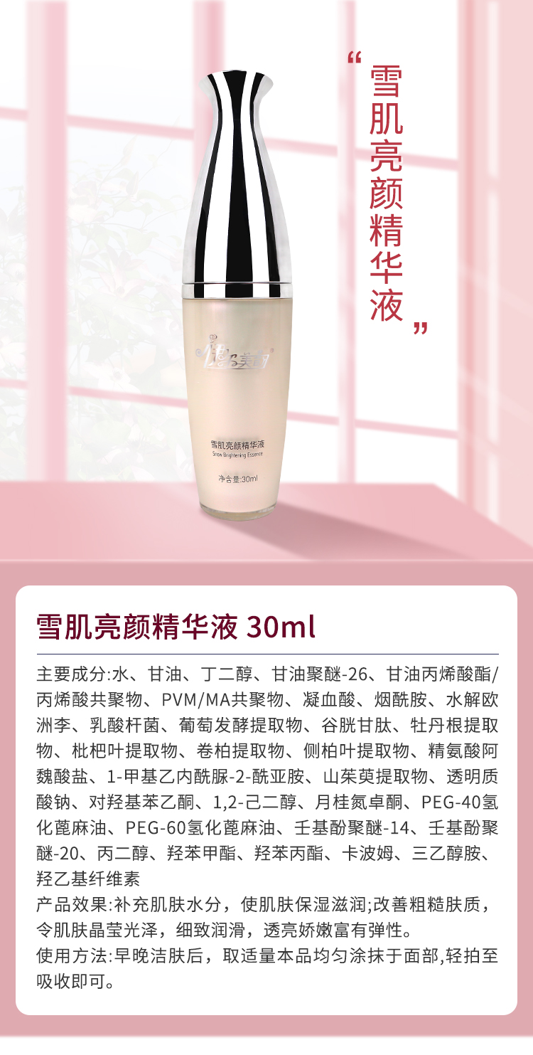 补充肌肤水分,使肌肤保湿滋润;改善粗糙肤质,令肌肤晶莹光泽,细致润滑,透亮娇嫩富有弹性