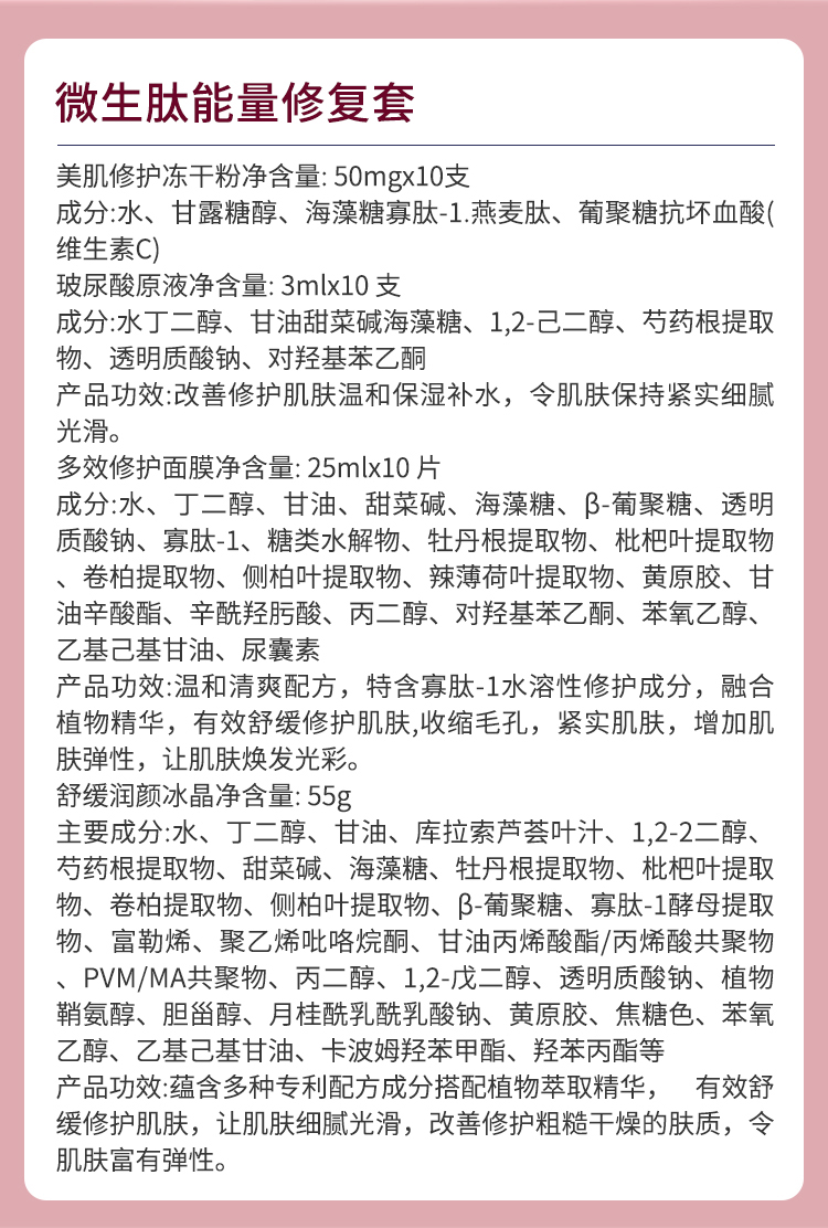 1.美肌修护冻干粉50mg*10支 2.玻尿酸原液3ml*10支 3.多效修护面膜25ml*10片 4.舒缓润颜冰晶55g