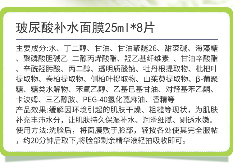 蒂曼莱儿 玻尿酸补水面膜25ml*8片 改善干燥/粗糙肌肤,持久保湿,润滑细腻,剔透水嫩