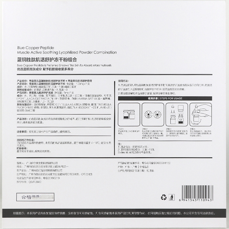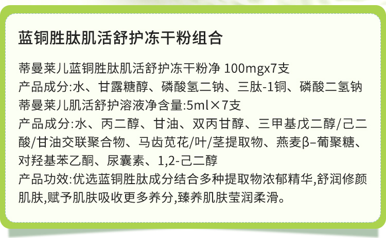 (冻干粉100mg+溶媒5ml)*7支。细腻柔滑的水漾质地,蕴含蓝铜胜肽萃取精华,改善修护肌肤,温和保湿补水,令肌肤保持紧实、细腻光滑