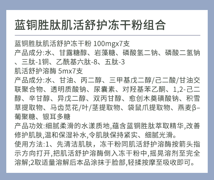 (冻干粉100mg+溶媒5ml)*7支。细腻柔滑的水漾质地,蕴含蓝铜胜肽萃取精华,改善修护肌肤,温和保湿补水,令肌肤保持紧实、细腻光滑