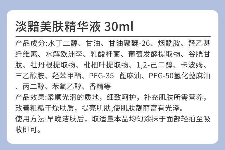 补充肌肤所需营养、细致呵护肌肤;改善粗糙干燥的肌肤,提亮肌肤,使肌肤娇嫩靓丽富有光泽