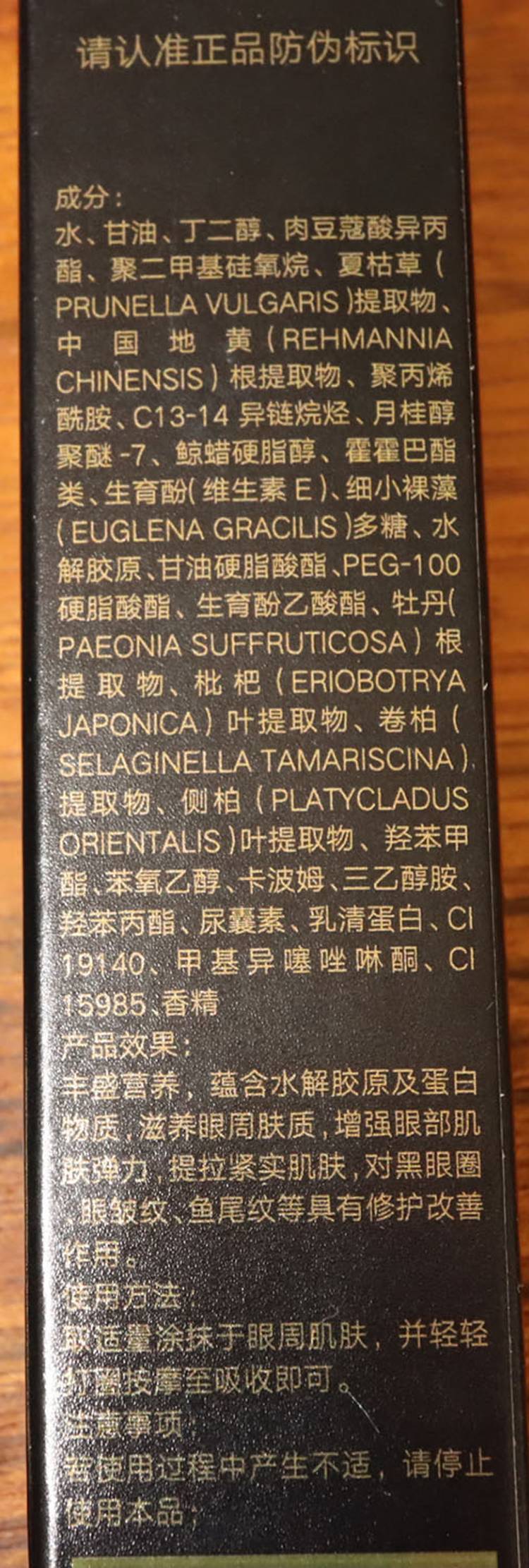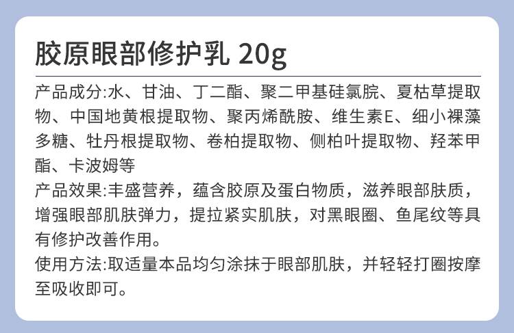 丰盛营养,蕴含水解胶原及蛋白物质,滋养眼周肤质,增强眼部肌肤弹力,提拉紧实肌肤,对黑眼圈、眼皱纹、鱼尾纹等具有修护改善作用