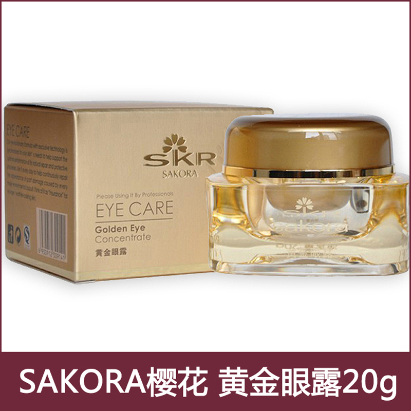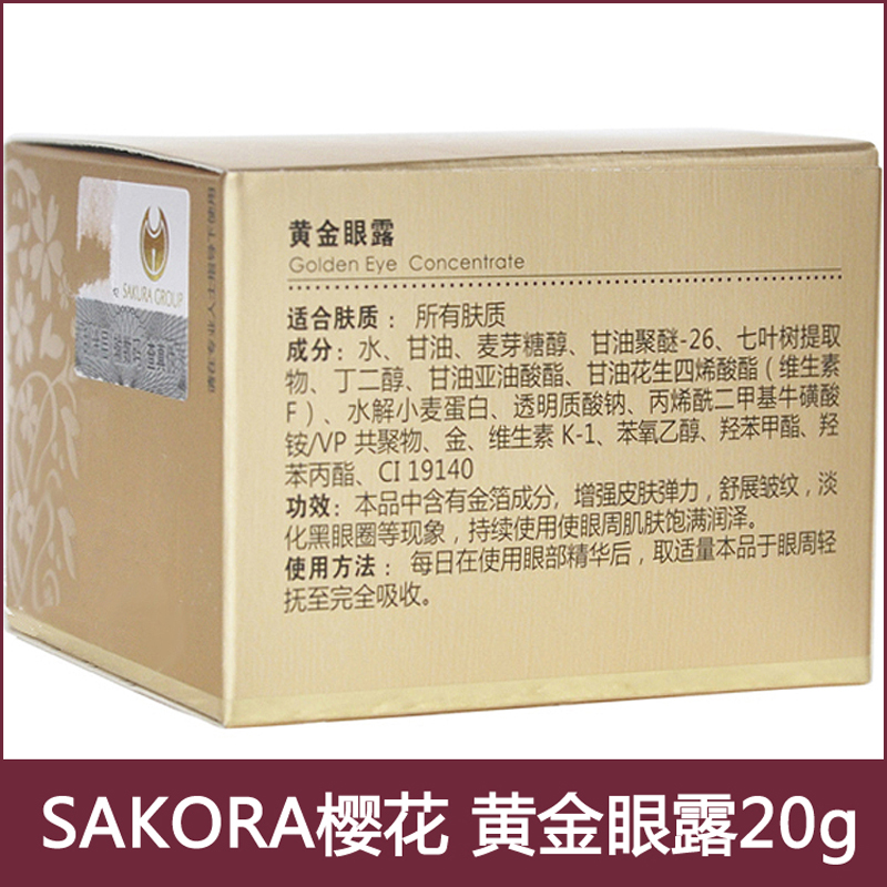 SAKORA樱花眼护B006 黄金眼露20g 特点功效:本品中含有纯金箔,有负离子果,能促进。防止眼周皮肤老化,恢复并保持皮肤的柔润,使眼周肌肤饱满丰润。增加皮肤弹力,淡化深纹并抚平细纹,改善眼周肌肤的血液循环,舒缓眼周肿胀,减轻黑眼圈、眼袋浮肿等现象。 产品成份:活性黄金、维生素K1、透明质酸、胶原蛋白等。 适合人群:任何眼部肌肤 使用方法:每日在使用眼部精华后,取少量本品于眼圈轻抚至完全吸收。