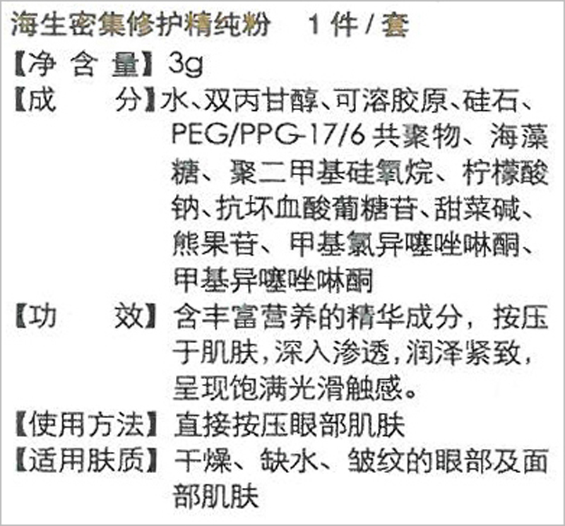 产品成份:日本海生物胶原质、维生素C、葡萄苷VC。