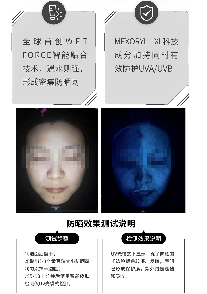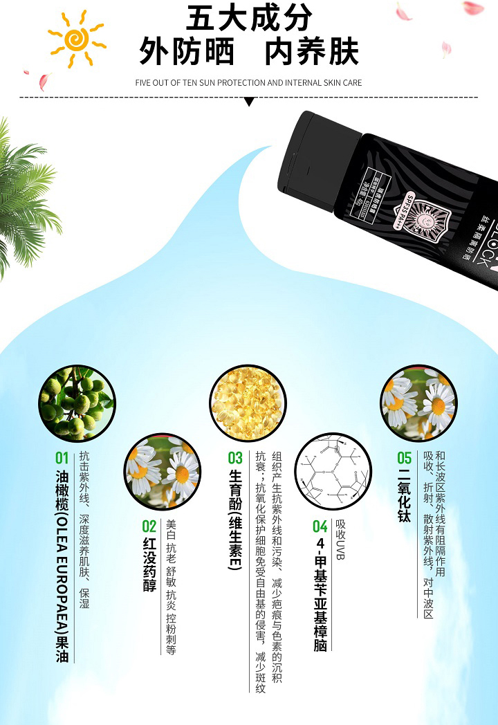 质地清爽、易推开、无黏腻感、不影响后续上妆。含UVA、UVB吸收隔离成分,有效阻挡阳光和紫外线的伤害
