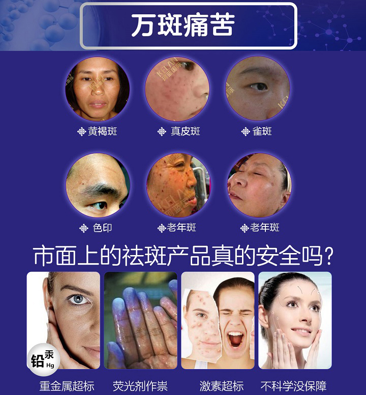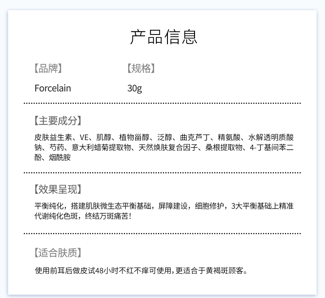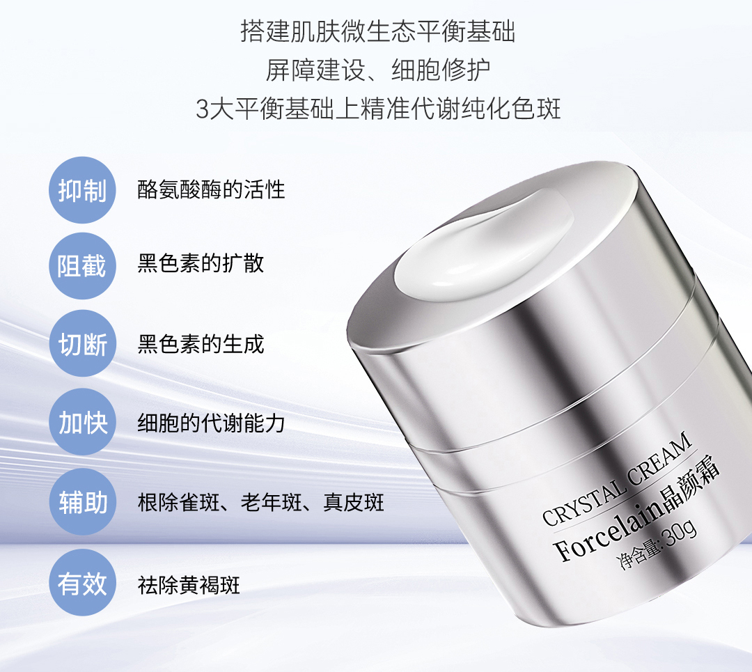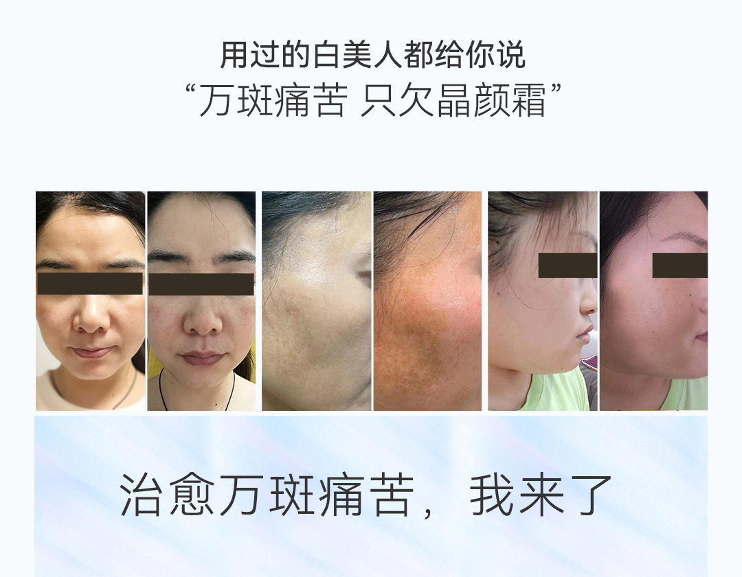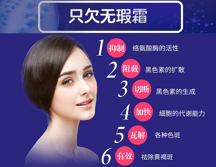 万斑痛苦,只欠无瑕霜! 改善黑黄肤质,祛黄净白美肌,收缩毛孔,紧致肌肤,有效减淡黄褐斑,辅助减淡黄******、*********、真皮斑。
