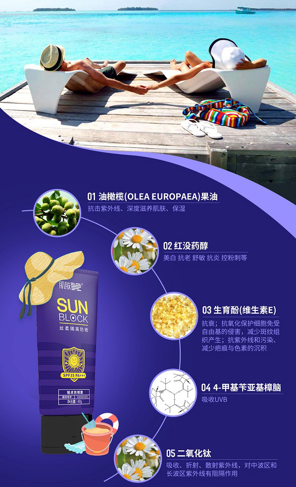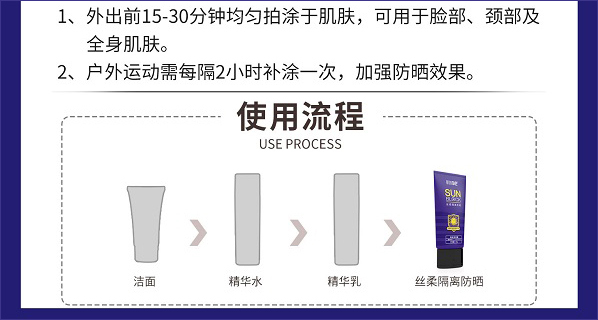 质地清爽、易推开、无黏腻感、不影响后续上妆。含UVA、UVB吸收隔离成分,有效阻挡阳光和紫外线的伤害