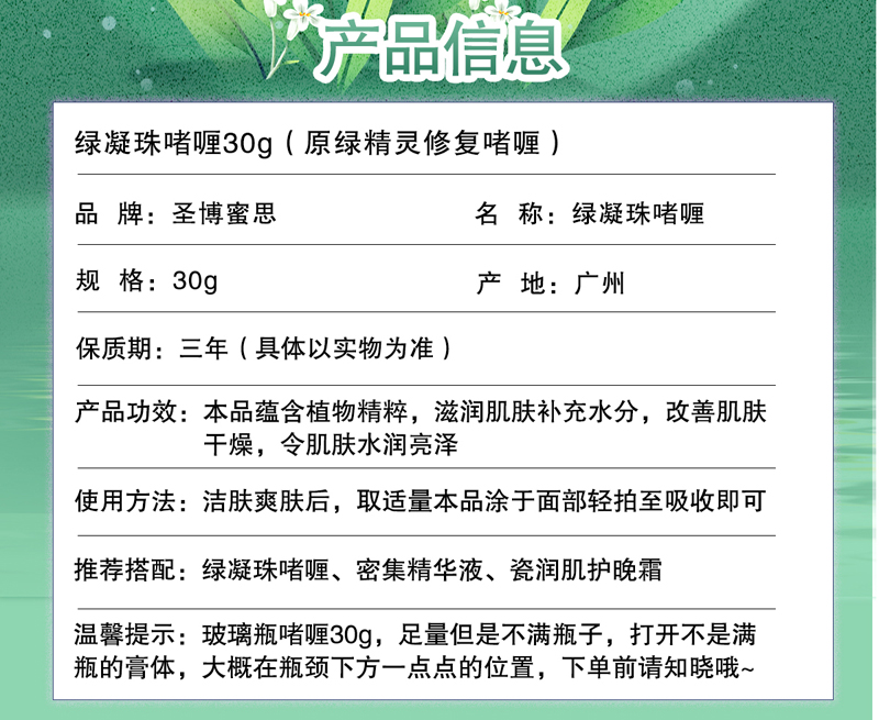 圣博蜜思 绿凝珠啫喱30g 水凝质地、清新水润、及时退红、多重滋养、随时舒缓脆弱敏肌