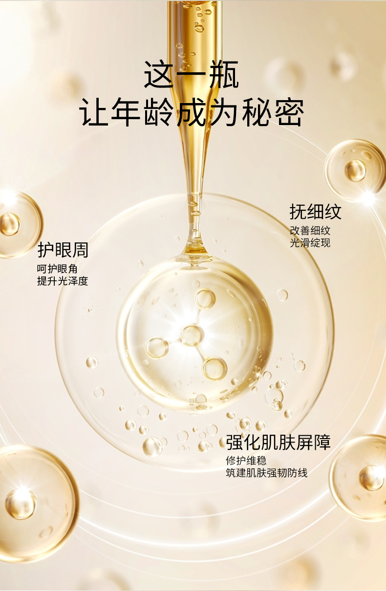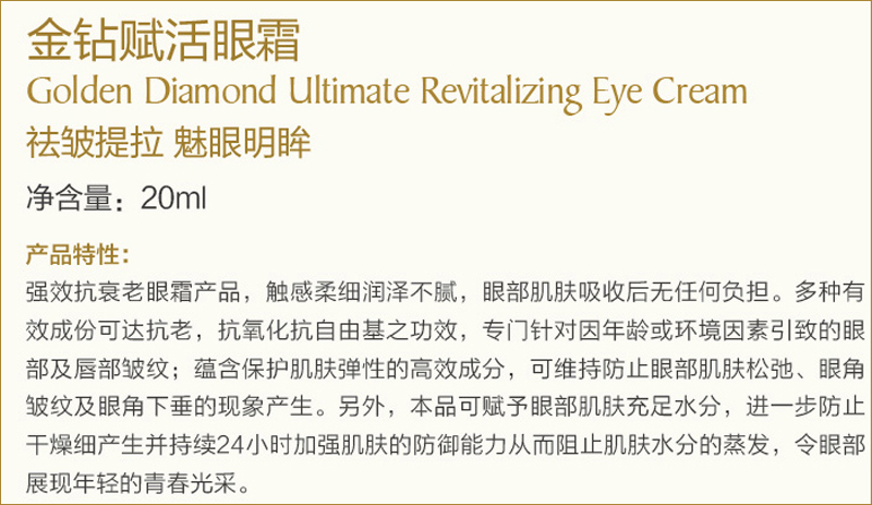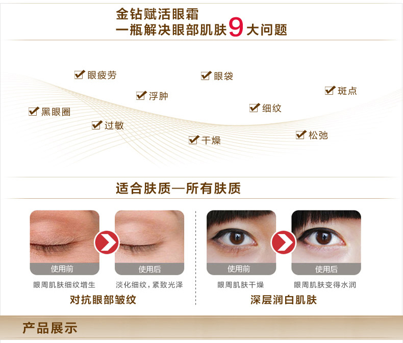 1.多效抗衰眼霜产品,触感柔细润泽不腻,眼部肌肤吸收后无任何负担。