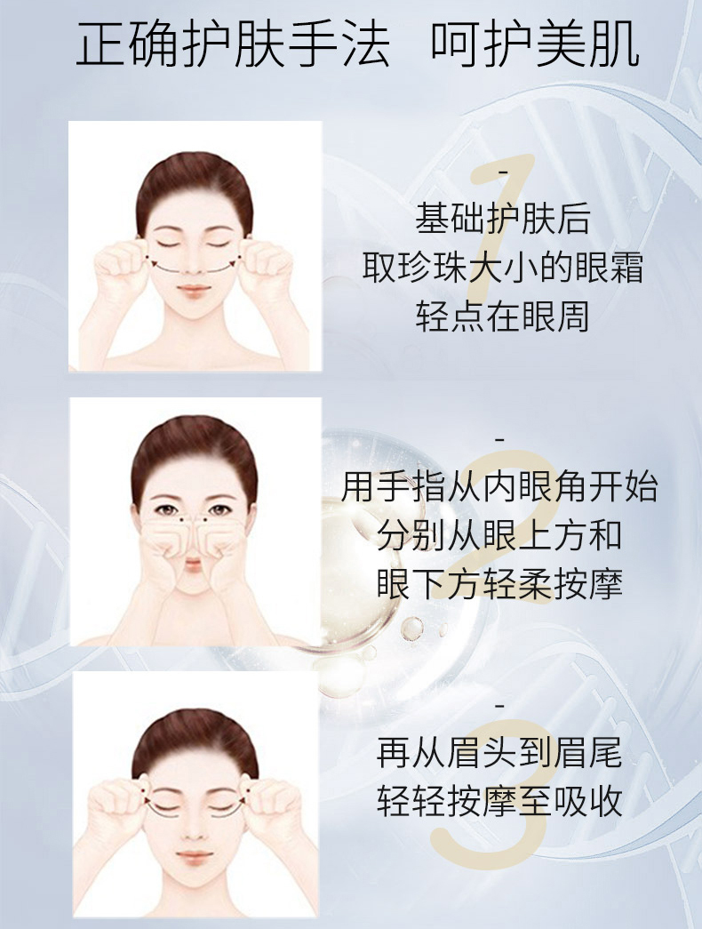 产品用法:晚间清洁爽肤后,取适量涂抹于眼周肌肤,轻轻按摩至吸收即可。