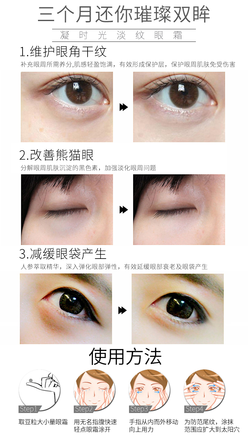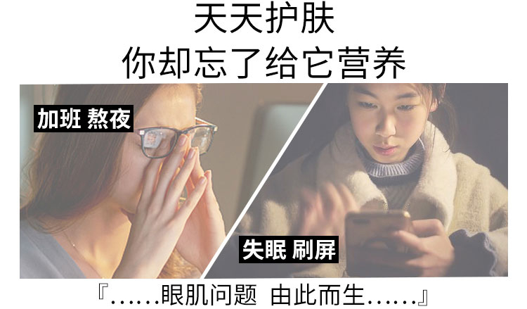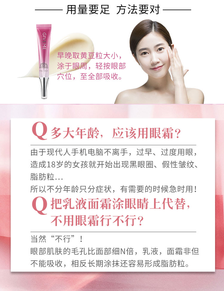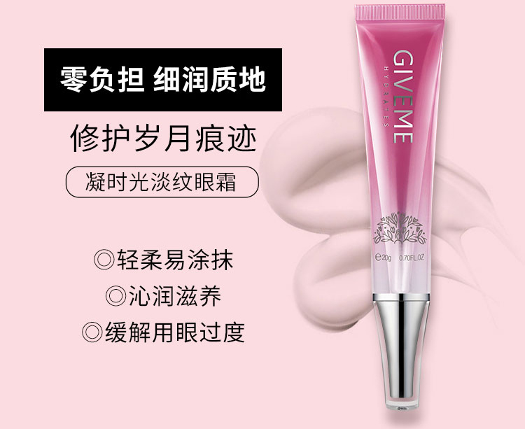 1.轻薄水润:轻薄细腻,水水的润润的,一次解决眼部肌肤干燥缺水问题。2.明眸焕采:促动眼部微循环,改善眼部皮肤的充血和淤堵,明亮眼周皮肤,去除熊猫眼。3.缓解疲劳:缓解熬夜、用眼过度等,双眸神采飞扬。4.平纹抗皱:放松面部肌肉,减少表情纹,从而淡化皱纹。