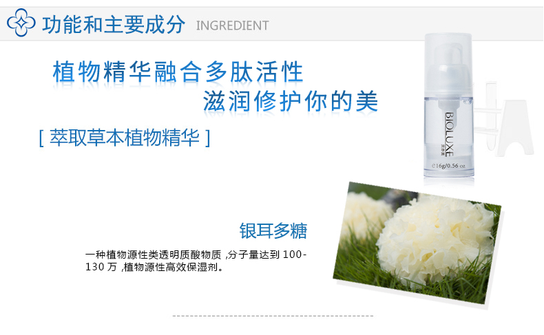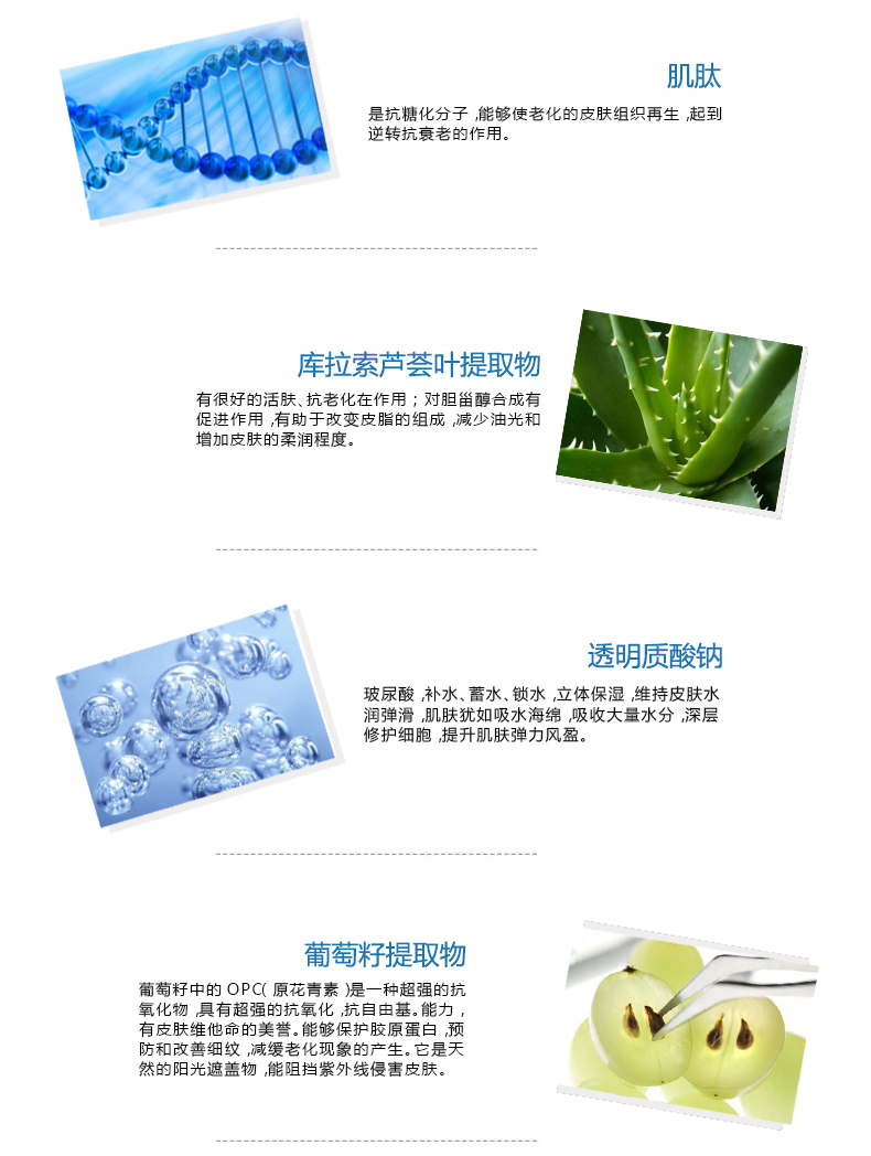 主要成分:奥氏海藻提取物、透明质酸、生物多肽、营养因子复合物(红景天提取物、缬氨酸、亮氨酸、异亮氨酸)。