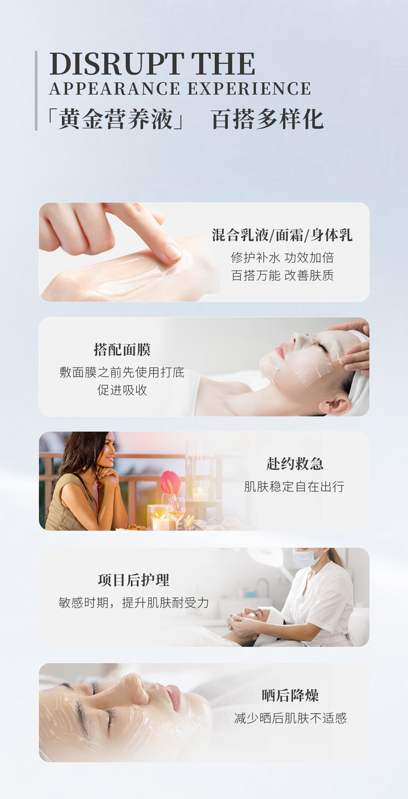 适用范围:适于各种肤质,尤其是问题性肌肤(如:晒后修复、肤色不均、纹刺、红血丝等)。