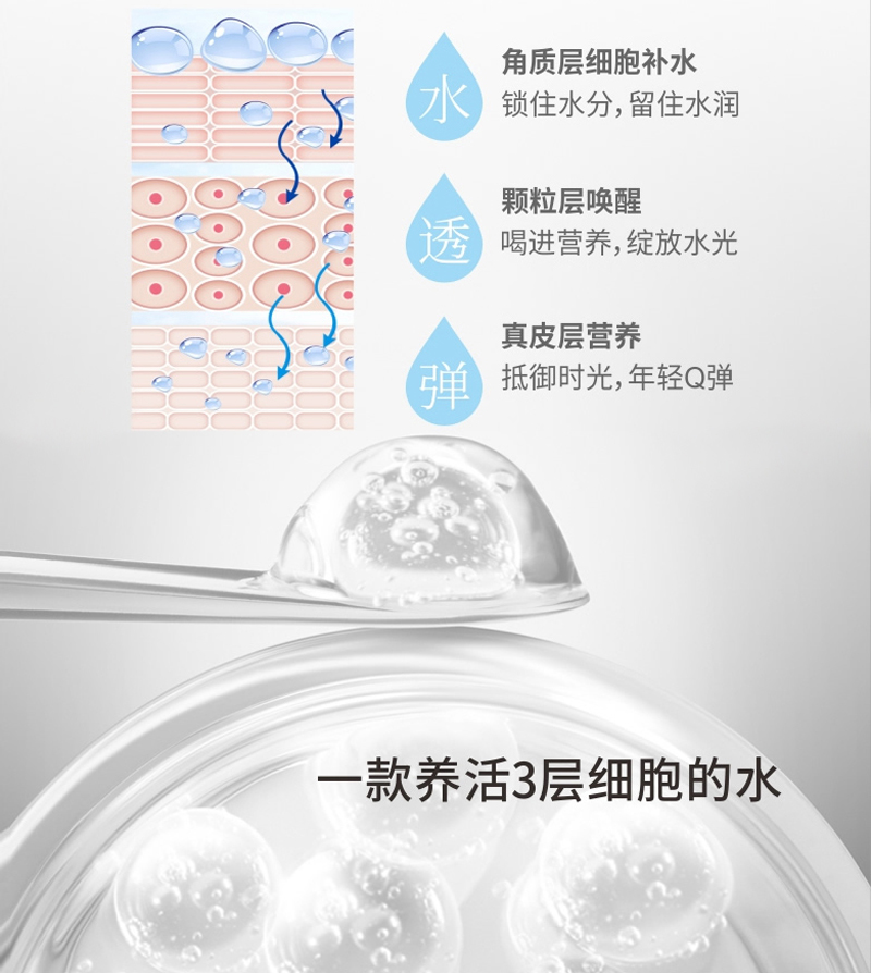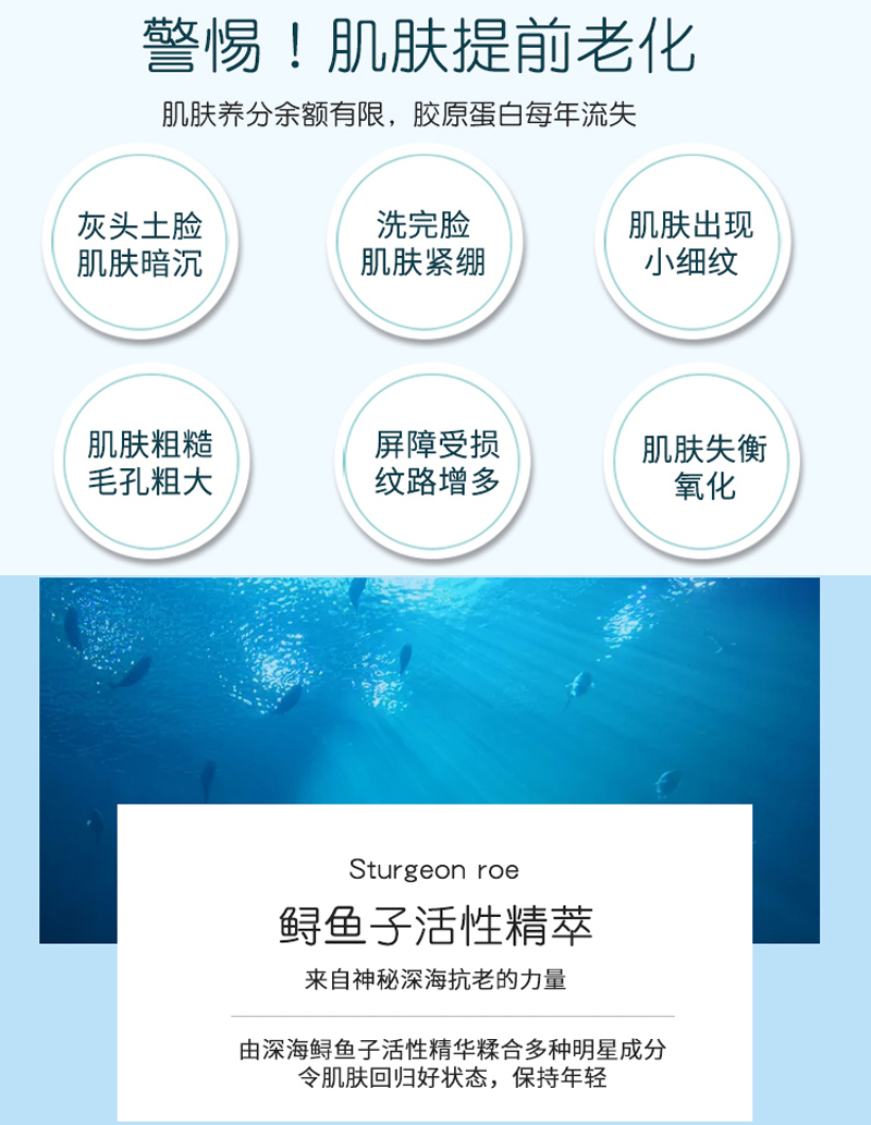 含多种植物萃取精华和鲟鱼子提取物,补充因外界因素而导致的干燥粗糙,无光泽肌肤所需的水份及营养成分,提升肌肤亮度和弹性,让肌肤展现水润质感