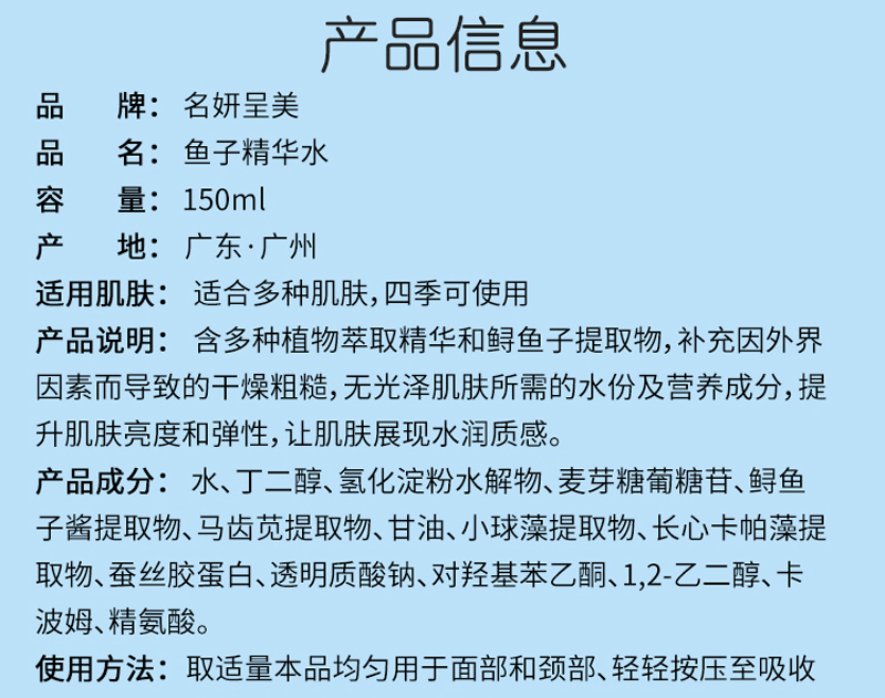 • 商品名称:名妍呈美 鱼子精华水150ml 补充水份及营养、提升亮度和弹性、改善干燥粗糙、无光泽肌肤