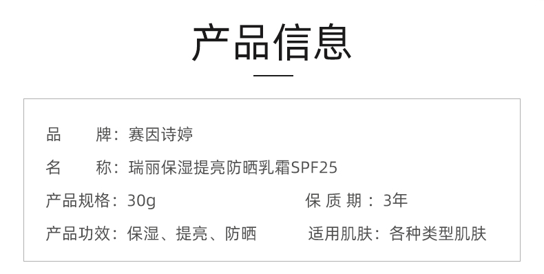 赛因诗婷 瑞丽保湿提亮防晒乳霜30gSPF25