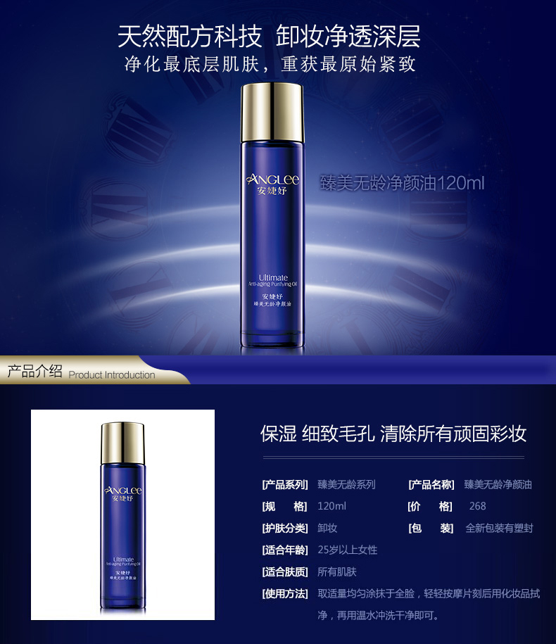 • 商品名称:安婕妤 臻美无龄净颜油120ml(升级版)遇水乳化、卸除残妆、清洁毛孔、去除老化角质堆积、温和亲肤