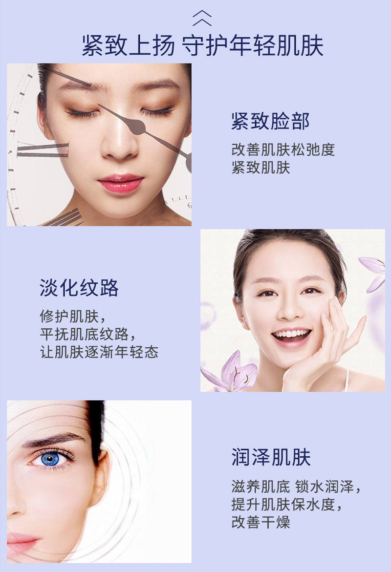 其采用生物大分子的弹性提拉技术,清新并极易吸收的乳霜配方,促进胶原蛋白的合成,深入肌底,由外而内淡化皱纹,使肌肤充满活力,持续使用可紧致容颜。 内撑外拉,紧实塑形,瞬间V脸,显著地增强皮肤弹性与紧实度,有调整下垂松弛肌肤,使脸部线条紧实立体,且自然真实不僵硬。由肌底改善维持年轻肌肤,不仅能改善已有的细小皱纹、改善深层皱纹,更能进一步预防新的细纹产生,赋予肌肤柔软、光滑细致的肤感