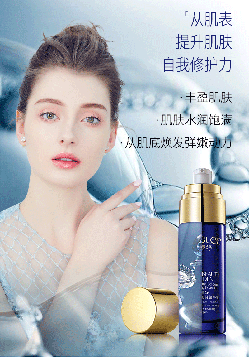 产品功:清新爽透的质感,焕新粗糙、老化肌肤,带来源源不断的活性保湿精华,能渗透肌肤深层,淡化细纹。持续使用,能改善老化肤质,呈现幼滑柔嫩肌肤。 恢复肌肤原有的水分调节机能,使之健康年轻。高纯度的保湿成分,比一般的精华液高出10倍,触碰肌肤瞬间化水吸收,使肌肤更加水嫩。