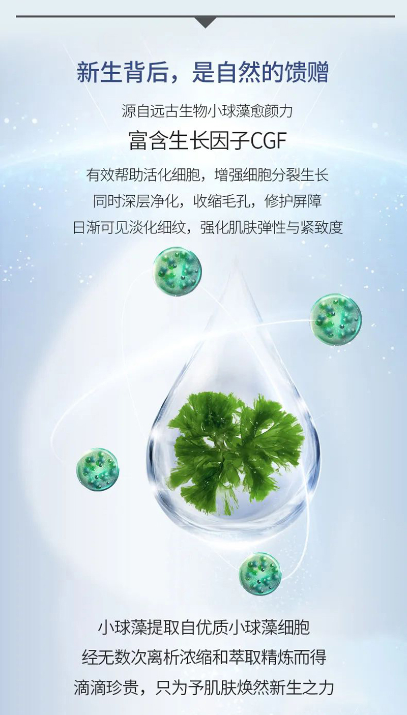 蕴含小球藻、玫瑰花水,等多重植物精粹深入肌底滋润,平衡肌肤水油。净化收敛毛孔。有效修护泛红敏肌,令肌肤水润柔嫩